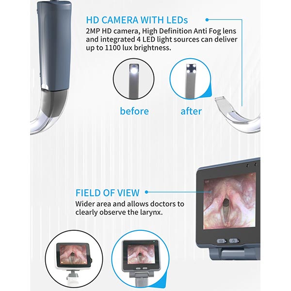 3.ভিউড ফিল্ড অফ ভিউ: আমরা এই ল্যারিঙ্গোস্কোপের ভিউয়িং অ্যাঙ্গেলটিকে সুন্দর এবং প্রশস্ত করেছি, যাতে আপনি আরও বড়, পরিষ্কার ভিউ পান৷ ডাক্তার এবং অপারেটররা স্বরযন্ত্রের গঠন সহজেই দেখতে পারে, সমস্ত ক্ষুদ্র শারীরবৃত্তীয় বিবরণ ধরতে পারে এবং পদ্ধতিগুলি পেতে পারে দ্রুত এবং আরো সঠিকভাবে সম্পন্ন